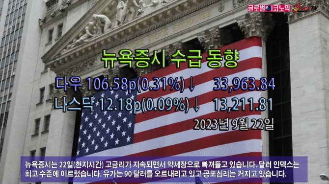 미국 국채는 급등 후 22일엔 소폭 내리며 조정국면입니다. 2년물은 전일보다 0.02%포인트 내린 5.10%로 마감됐습니다. 10년물은 전일보다 0.05%포인트 하락한 4.44%로 장을 마쳤습니다.