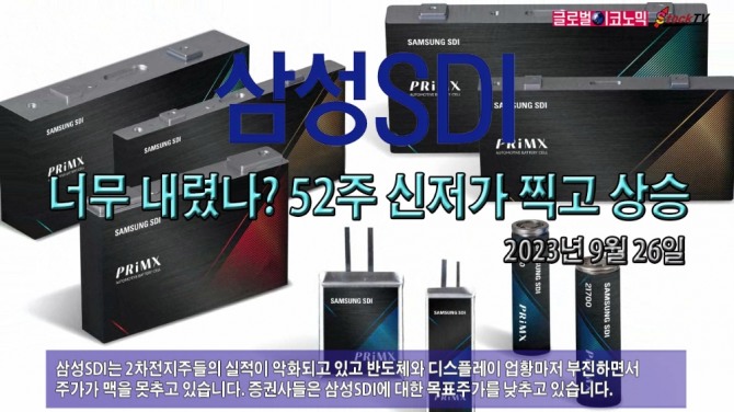 삼성SDI의 주가는 26일 전일보다 1000원(0.19%) 오른 52만2000원에 장을 마쳤습니다. 장중엔 52주 신저가 51만5000원을 찍었습니다. 이날 거래량은 전일보다 38%가량 줄었습니다.