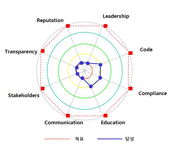 지금까지 진단한 내용을 바탕으로 ‘8-Flag Model’로 측정한 도로공사의 윤리경영 성취도를 종합하면 그림과 같다. 도로공사는 윤리헌장, 제도운영, 윤리교육프로그램은 보통수준을 유지했지만 다른 영역은 모두 낙제점을 벗어나지 못했다. 주인 없는 곳이 공기업이고, 임직원들의 천국이라고 불리는 이유를 적나라하게 보여준 전형이 도로공사였다. 경영합리화나 효율을 위해 노력한다는 어떤 징후도 찾기 어려웠다. 오로지 자신들의 이익과 복지를 위해 일을 하고, 퇴직 이후도 서로 협력해 챙겨주면서 국민의 세금을 축내고 있었다. 윤리경영을 통한 경영혁신의 필요성을 절실하게 느끼게 해 준 공기업이다.
