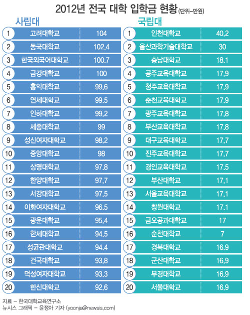 전국 대학중 입학금이 가장 비싼 대학은 고려대로 104만원 이었다. 이는 올해 서울시립대의 인문사회계열 한 학기 평균 등록금 102만2000원보다도 비싸다.