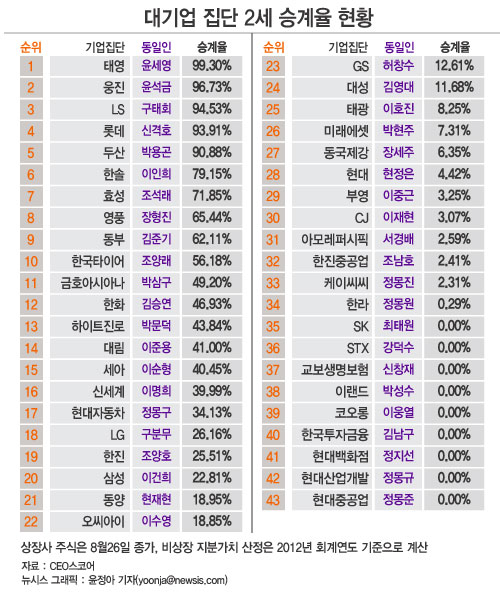 최근 기업경영성과 평가 사이트인 CEO스코어가 국내 62개 상호출자제한 기업집단 중 총수가 있는 43개 그룹의 자녀에 대한 주식 자산 승계율을 조사한 결과 30.03%인 것으로 집계됐다.