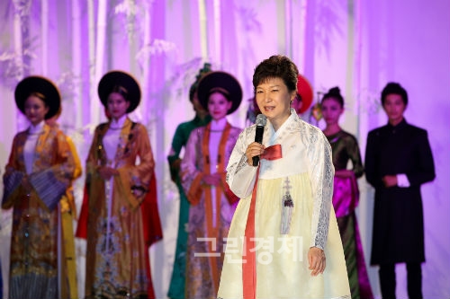 박근혜 대통령이 8일 베트남 하노이에 있는 경남하노이랜드마크 컨벤션홀에서 열린 한복ㆍ아오자이(베트남 전통의상) 패션쇼에 참석, 인사말을 하고 있다. 2013.09.09. (사진=청와대 홈페이지)