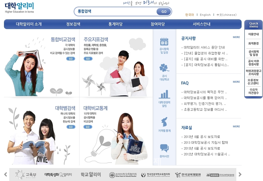 [글로벌이코노믹=노정용기자] 학교운영의 투명성을 제고하고 수험생의 진학지도와 기업의 채용을 돕기 위해 지난 2009년 도입된 '대학알리미(www.academyinfo.go.kr)'가 대학의 성의 없는 정보공개로 제 역할을 다하지 못하고 있다는 지적이 잇따르고 있다.현재 '대학알리미' 사이트에는 일반대학, 산업대학, 교육대학, 전문대학, 각종학교 등 전국 362개 대학의 2013학년도 등록금· 재학생 및 졸업생 성적 전임교원 강의 담당 비율, 2012년도 장학금 지급률· 취업률 등이 올라와 있다.