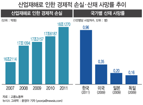 11일 고용노동부 통계에 따르면 산업재해로 인한 경제적 손실액은 2010년 17조6187억원, 2011년 18조1270억원에 이른다. <뉴시스>