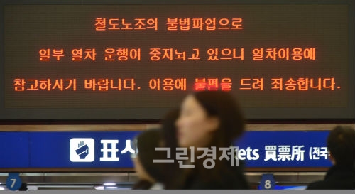 전국철도노동조합이 수서발 KTX 설립이사회 개최 중단 등을 요구하며 총파업 투쟁 돌입을 선언한 9일 오전 서울 용산구 동자동 서울역 매표소 전광판에 파업관련 내용이 안내되고 있다.