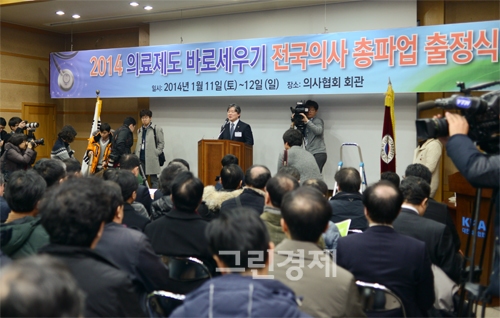 [글로벌이코노믹=윤나연기자] 11일 오후 5시 서울 용산구 이촌동 대한의사협회관에서 열린 '2014 의료제도 바로세우기 전국의사 총파업 출정식'에 보건의료 정책을 반대하는 대한의협 소속 지역 대표들이 참석했다.