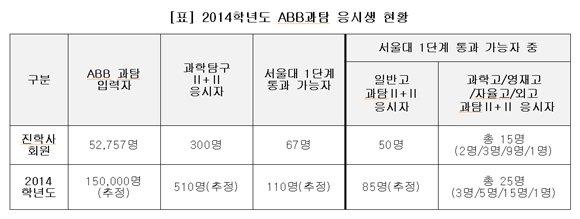 과학탐구 Ⅱ가 공부하기 어려운 과목인 만큼 좋은 성적을 내기 어렵기 때문에 통과가 가능한 수험생이 적은 것으로 보인다. 서울대 자연계 정시 지원율(4.50:1)과 진학사 정시 모의지원율(2.65:1)의 차이가 약 1.7배 정도 차이가 나기 때문에 이 비율로 실제 응시자를 추정해 보면 2014학년도 수능응시생 중 과학탐구 Ⅱ+Ⅱ를 응시한 수험생은 510명이며, 서울대 1단계 통과 가능 학생은 110명 선으로 추정된다.