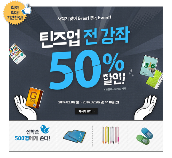 오는 2월 28일까지 중고생 틴즈업 회원이라면 누구나 강좌 50% 할인 혜택을 누릴 수 있으며 선착순 구매자 500명에게는 틴즈업 지퍼파일, 팬시 볼펜, 수정테이프 등 필수 문구류로 구성된 기념품을 추가로 증정한다. 이벤트 내용과 영역별·학년별 추천 강좌 등 더욱 자세한 소식은 틴즈업 홈페이지(www.teensup.com)를 통해 확인할 수 있다.