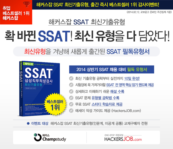 언어·추리영역의 새로운 유형도 반영됐다. 역사·인문학 상식을 강화하는 등 삼성에서 발표한 변경안이 모두 적용됐다. 변경된 SSAT 유형을 신속히 반영해 새롭게 출간된 해커스잡 SSAT 교재는 10일 출간된 이후로 단 며칠만에 교보문고 베스트셀러에 올랐다.
