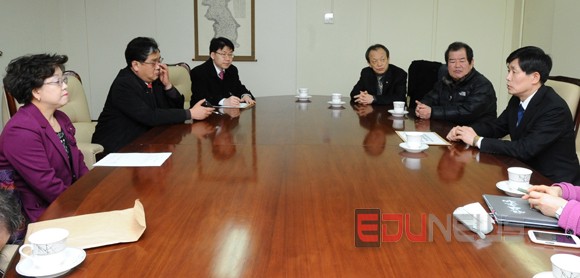 이미지 확대보기서울특별시교원단체총연합회(서울교총)와한국교원단체총연합회(한국교총)등교원단체가18일서울김관복부교육감(오른쪽)을항의방문해누리과정5시간운영지침즉각철회,유치원전담교무업무보조인력확대배치등을요구했다.