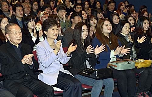 박근혜 대통령이 26일 오후 2월 '문화가 있는 날' 행사의 일환으로 서울 종로구 대학로12길 한 극장에서 공연중인 창작뮤지컬 '김종욱 찾기'를 관람하고 있다.