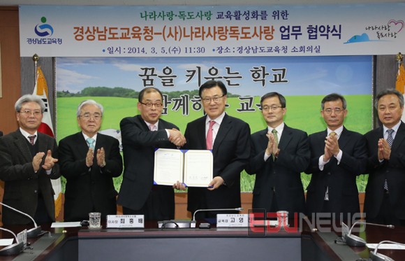[글로벌이코노믹=정수현 기자] 경상남도 고영진 교육감은 사단법인 나라사랑독도사랑과 5일 독도사랑․나라사랑교육 활성화를 위한 업무 협약을 체결했다. 이번에 맺은 업무 협약 주요 내용으로는 독도 현장 체험방문을 비롯해 △수준별‘맞춤식’독도교육 자료 개발 △교원 독도교육 역량강화 연수 △현장 연구 활동 지원 △독도교육 컨설팅 등 다양한 분야가 포함됐다.