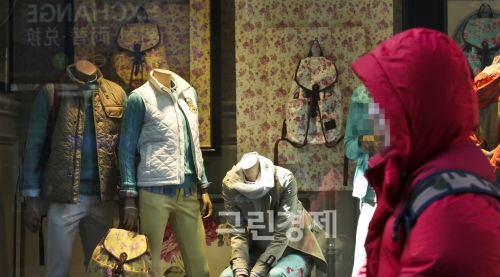 ▲▲꽃샘추위가찾아온6일오전명동의한옷가게에봄을알리는화사한옷들이진열되어있는가운데한시민이두꺼운겨울옷을입고그앞을지나가고있다.사진=김영웅기자