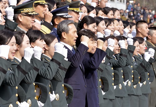 박근혜 대통령이 6일 오후 충남 개룡대 연병장에서 열린 2014년 합동 임관식에 참석해 김관진 국방부 장관을 비롯한 신임장교들과 파이팅을 외치며 기념촬영을 하고 있다.