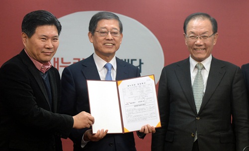 6·4 지방선거 서울시장 출마를 공식선언한 김황식 전 국무총리가 15일 오전 서울 영등포구 여의도동 새누리당사에서 새누리당 입당원서를 들어보이고 있다. 왼쪽부터 홍문종 새누리당 공천관리위원장, 김 전 총리, 황우여 대표.