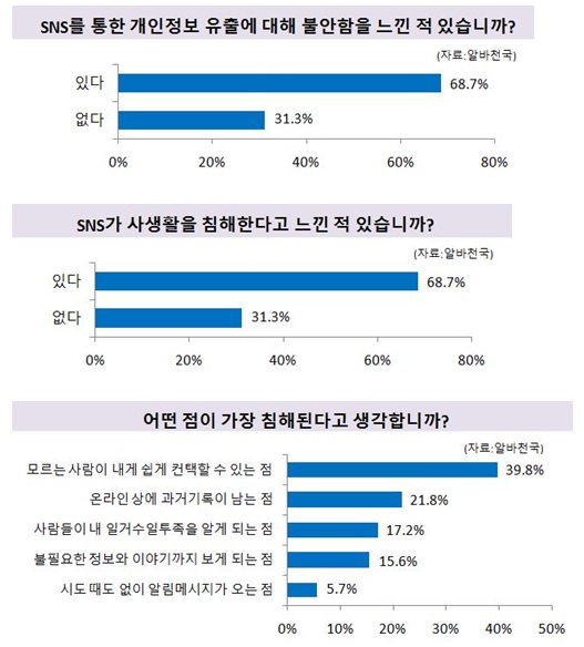아르바이트 전문포털 알바천국(대표 최인녕)은 16일 전국 10대에서 60대까지 남녀 회원 2205명을 대상으로 ‘SNS 사생활 침해의식’에 대한 설문결과를 공개했다.