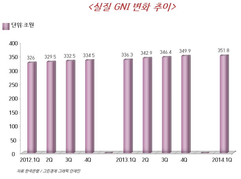 한은에 따르면 올 1분기 실질 GNI 성장률은 전분기대비 0.5% 증가하는데 그쳤다. 이는 지난 2012년 1분기에 기록한 0.3% 이후 가장 낮은 수치다.