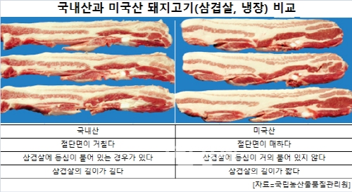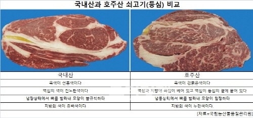 특히 농수산물의 경우, 육안으로 원산지를 식별하기 어렵다는 점을 이용해 원산지를 둔갑시키는 사례가 늘어나고 있다.실제 농관원 홈페이지에 게재돼 있는 국내산과 수입산 돼지고기와 한우를 비교한 자료에 따르면 소비자들이 원산지를 식별하기 어려운 것으로 파악됐다.