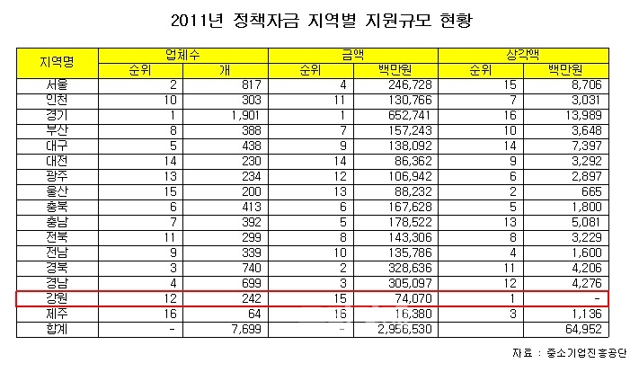 반면, 강원도 중소기업에 대한 지원규모는 2011년에는 16위인 제주도에 이어 15위, 2012년과 지난해에는 연이어 14위로 최하위권을 맴돌고 있는 것으로 드러났다.