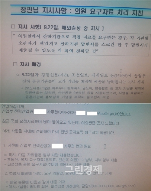 6일 김제남 의원이 공개한 '장관님 지시사항 : 의원 요구자료 처리지침'에 따르면 산업부는 산하기관 답변서를 기관별 소관과가 사전 검토를 거쳐 제출토록 지시한 것으로 드러났다.