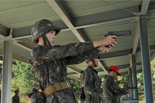 최태원SK회장의딸최민정해군사관후보생훈련중권총사격을하고있다.
