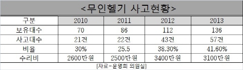 새누리당 윤명희 의원은 농협으로부터 제출받은 무인헬기 사고현황에 따르면 2013년 무인헬기 사고발생률이 41.6%로 나타났다고 22일 밝혔다. 이는 당시 보유 헬기 136대 중 57대에 해당하는 수치다.이와 함께 무인헬기 도입비용은 1억4675만원(주 기종인 REMO-HⅡ 기준)으로 평균 운영경비 (2013년 기준)는 대당 평균 5490만원이 투입된다.