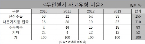 특히 지난 2009년에는 전북 임실 오수관촌농협에서 인명사망사건도 일어난 바 있다.또 윤 의원은 "농협중앙회에서 제시한 헬기 사고 유형은 전선추돌, 나뭇가지 등의 접촉, 조정 미숙 등으로 구분하고 있는데, 이는 엄밀히 말하면 모두 조정미숙이 아니냐"고 지적했다.