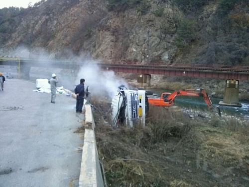 이미지 확대보기황산 탱크로리(운전자, 조모씨‧53)가 경북 봉화군 석포면 낙동강 상류 지역에서 5일 전도됐다. 다행히 큰 인명피해로 이어지진 않았지만, 사고로 황산 2000ℓ 정도가 흘러나왔고 일부는 낙동강 상류로 들어가 소방당국과 행정당국이 긴급 방제를 하고 있다.