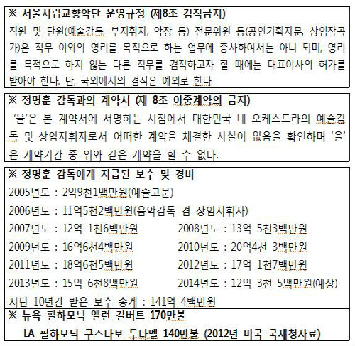 아울러 “서울시에서 정명훈 예술감독에게 2005년부터 금년 말까지 지급된 보수 및 경비가 141억 원에 달한다며, 세금으로 지원 되는 것인 만큼 국내에서 활동 시 성실한 활동”을 요구했다