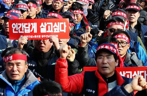 23일 오후 광주 북구 건국동 정부합동청사에서 민주노총 전국건설노조원들이 규탄집회를 열고 광주지방고용노동청 측에게 건설현장 외국인력 불법고용 실태에 대한 현장조사를 촉구하고 있다.