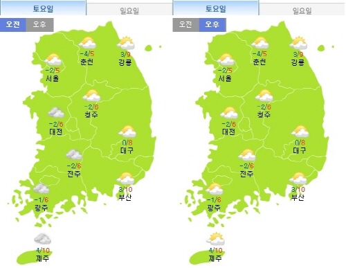 내일 아침 최저기온은 -6도에서 3도, 낮 최고기온은 4도에서 10도가 되겠다. 서울·인천·경기도는 아침 최저기온 -6도에서 -1도, 낮 최고기온 5도에서 6도가 되겠다.