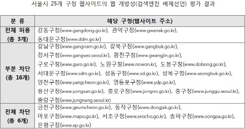 이번 조사 결과를 구체적으로 살펴보면, 전체 25개 서울시 구청 중 강동구청과 관악구청, 동대문구청 등 3곳만 검색 엔진의 정보 수집을 전면 허용하고 있다. 강남구청, 강북구청, 강서구청, 광진구청, 구로구청, 노원구청, 도봉구청, 서대문구청, 성동구청, 성북구청, 양천구청, 영등포구청, 용산구청, 종로구청, 중구청, 중랑구청 등 16개 웹사이트는 검색 엔진 접근을 부분 차단하고 있는 것으로 나타났다.
