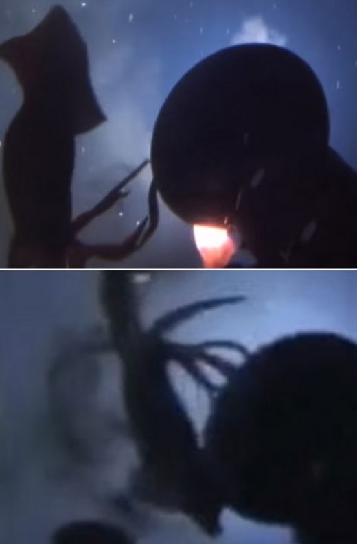 영상에는 수중에서 잠수정과 마주한 대왕오징어가 먹물을 뿜어대며 긴 촉수를 이용해 잠수정을 공격한다. 잠수정의 조명에도 불구 엄청난 양의 먹물에 시야가 어두워진다. 맘껏 먹물을 분사한 대왕오징어가 사라진다. 탐사 중인 잠수정이 자신을 위협하는 줄 알고 덤벼든 것으로 추정된다.