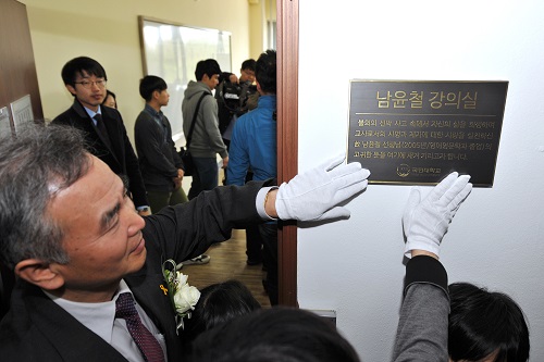 이미지 확대보기남 교사의 모교인 국민대학교는 8일 고인의 마지막 전공 수업 강의실인 북악관 708호를 ‘남윤철 강의실’로 지정하고 명명식을 열었다.