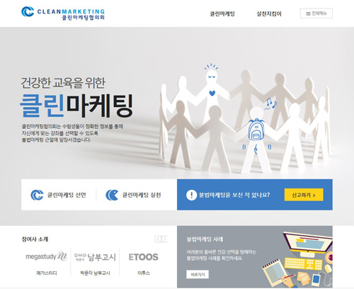 ‘클린마케팅협의회’는 허위·왜곡·과장광고, 상호비방, 개인정보 불법활용 등 온라인 교육 업계의 지나친 경쟁으로 만연해진 비양심적·불법적 마케팅 활동에 대해 업계 스스로 자정하고, 이를 근절해 나가자는 취지로 출범한 협의회다. 메가스터디교육, 박문각남부고시, 이투스교육 등 온라인 교육 대표 3사가 참여했으며, 3사는 향후 참여사의 불법마케팅 활동이 사실로 확인될 경우 협의회에서 정한 규정에 따라 해당 업체에 각종 페널티를 부여하기로 협의했다.