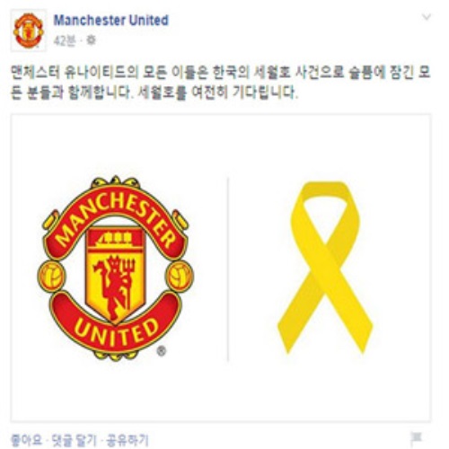 지난 16일 오전 8시 49분(한국시각) 맨유는 SNS 등을 통해 "세월호 사고로 슬픔에 빠진 모든 분들과 마음을 함께한다"며 "여전히 세월호를 기다린다"고 애도의 뜻을 전했다.