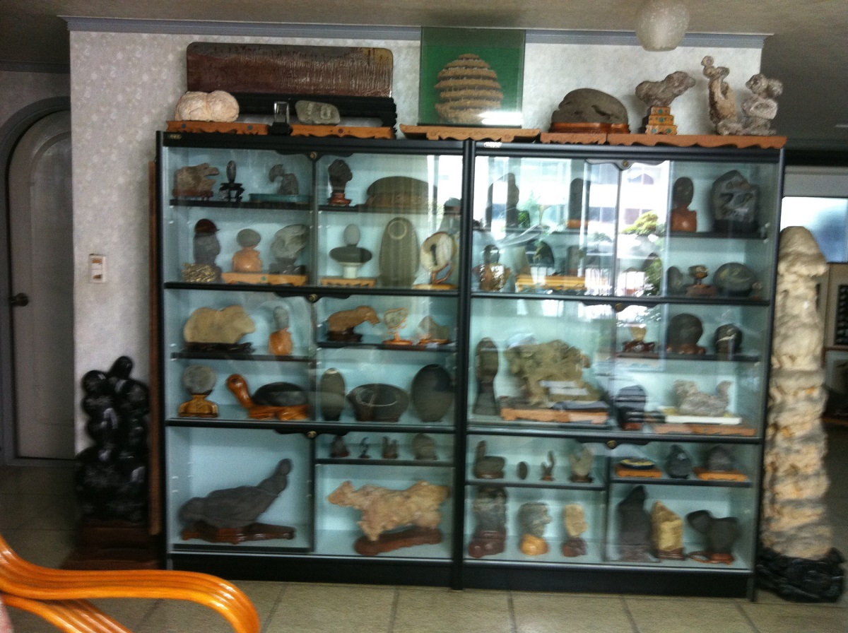 또 다른 취미는 수석 모으기다. 수석을 찾기 위해 전국 안 가본 곳이 없다. 이렇게 모은 수석이 200여점이다. 지금은 좋은 수석을 찾아내기가 여간 어렵지 않다. 배를 빌려 섬으로 나가기도 했다. 사진에 많은 시간을 할애하면서부터는 수석은 경매장이나 지인들로부터 사들이는 실정이다. 200여점의 수석은 주로 형태석이나 인물상이며, 숫자가 박힌 돌은 2와 5를 제외하고 다 있다. 분재 기르기 취미도 있어 수령이 150년 된 일본산 철쭉도 가지고 있다.