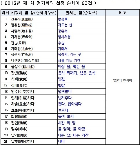 1박 이상의 야영(들살이)에 필요한 장비를 넣은 배낭을 짊어지고 산과 들을 마음 내키는 대로 자유롭게 걸어다니는 여행을 뜻하는 ‘백패킹(backpacking)’의 순화어로는 ‘배낭 도보 여행’과 ‘등짐 들살이’, 무작위로 생성되는 난수로 구성된 일회용 비밀번호나 이를 이용하는 인증 방식을 이르는 ‘오티피(O.T.P·One Time Password)’는 ‘일회용 비밀번호’, 차량 지붕 전체를 강화 유리 등으로 덮은 지붕창을 이르는 ‘파노라마 선루프(panorama sunroof)’은 ‘전면 지붕창’을 순화어로 선정됐다.