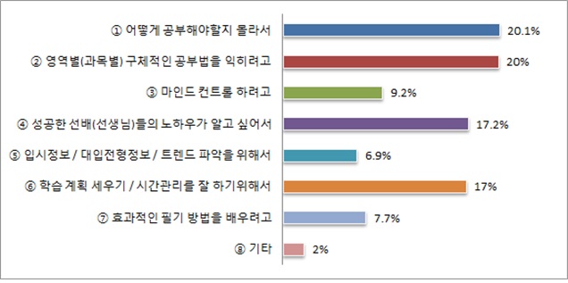 공부법 관련 책을 읽는 이유로는 ‘어떻게 공부해야할지 몰라서’(20.1%) ‘영역별 구체적인 공부법을 익히려고’(20%) 등으로 절반에 가까운 학생들이 공부법을 익히기 위해서라고 답했다. 이 외에 ‘성공한 입시 노하우를 알고 싶어서’(17.2%), ‘시간관리를 잘 하기 위해서’(17%) 등의 답변이 이어졌다.