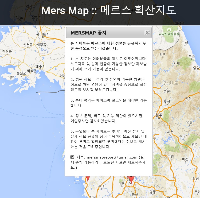 해당 개발자는 "본 사이트는 메르스에 대한 정보를 공유하기 위한 목적으로 만들어졌다"고 공지를 통해 밝혔다.
