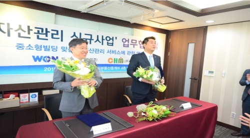이미지 확대보기5일 빌딩전문 중개법인인 원빌딩은 시설관리 전문기업인 ㈜씨에이치엠(이하 ‘CHM’)과 ‘중소형빌딩 자산관리 서비스-씨원케어(C-Won CARE)’ 런칭에 따른 업무협약식을 지난 3일 체결했다고 밝혔다.