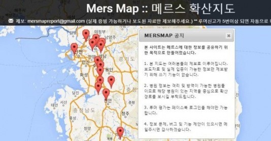 해당 웹사이트는 전국 지도를 전면에 게재한 뒤 메르스 환자가 치료, 또는 확진 판정을 받았거나 격리돼 있는 병원을 표시해 알리고 있다.