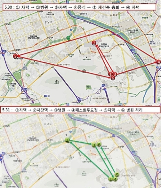 이 메르스 의사는 메르스 증상이 시작된 지난달 29일 병원 근무 뒤 강남구 세곡동 자택으로 돌아갔다. 이튿날인 지난달 30일 오전 9시부터 12시까지 병원 대강당에서 열린 심포지엄 참석 후 이날 오후 6시부터 7시까지 송파구 문정동 가든파이브에서 밥을 먹었다. 이후 오후 7시부터 30분간 서초구 양재동 L타워에서 1565명이 참석한 재건축조합 총회에 참석 후 귀가한 것으로 알려졌다.