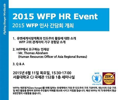이번 간담회는 WFP 아시아지역 본부장, 공여국장, 아시아 지역 인사 담당자 등이 참석하여 11일 오후 3시 30분부터 서울대 CJ 국제관 152동 1층 세미나실에서 한 시간 반가량 진행된다. 국제기구 취업 및 WFP 취업에 관심 있는 사람이면 누구나 참여가 가능하다.