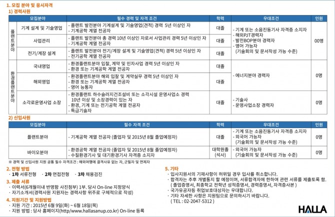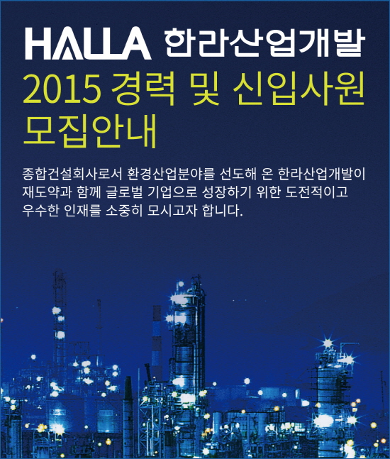 이미지 확대보기[글로벌이코노믹 안재민 기자] 한라산업개발에서 2015년도 신입 및 경력사원 모집에 들어갔다.