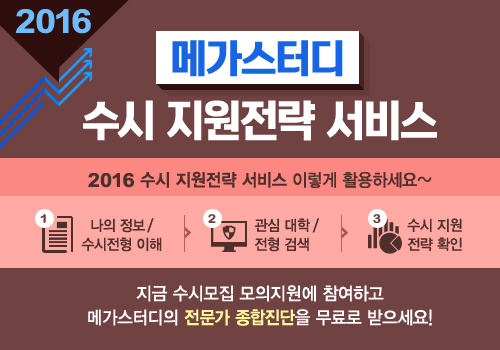 ‘2016 수시 지원전략 서비스’는 수험생들이 본인의 모의고사 성적, 학생부 성적 등을 기반으로 지원 가능한 대학을 찾아 보고, 합격 가능성을 판단할 수 있도록 각종 정보를 제공하는 서비스다. 수험생들은 전형별/지역별/계열별 등으로 분류된 카테고리 선택을 통해 다양한 수시전형 중 본인에게 유리한 전형을 쉽고 빠르게 파악하여 모의지원을 할 수 있으며, 지망 대학별 수능 최저학력기준 충족 여부도 확인할 수 있다.