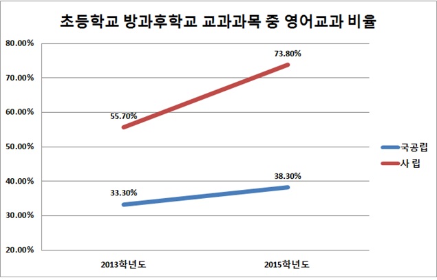 국회 교육문화체육관광위원회 소속 정진후 의원(정의당)이 최근 3년간(2013-2015학년도) 초등학교 방과후학교 현황을 분석한 결과 사립초 방과후학교 교과과목 중 영어교과 비율이 55.7%에서 73.8%로 18.1%p 증가했다. 반면에 같은 기간 국공립은 33.3%에서 38.3%로 5.1%p 증가하는데 그쳤다.