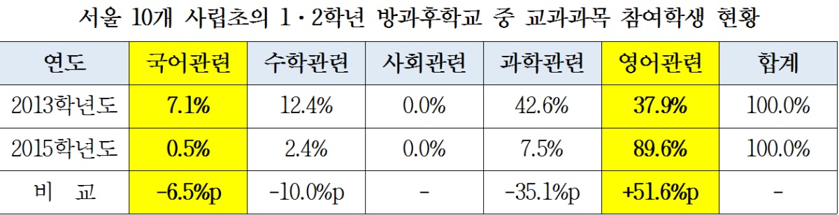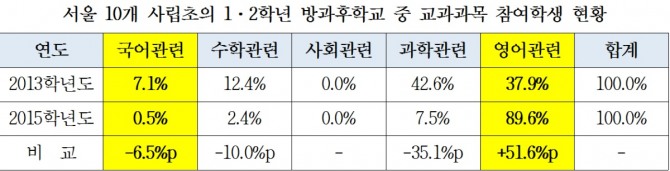 서울 10개 사립초, 1·2학년 방과후학교 교과과목 중 영어 90% 차지