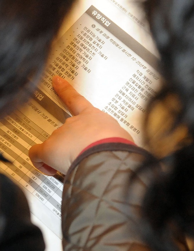한국직업능력개발원은 2014년 ‘한국의 직업지표 연구’를 통해 10년 후 전망이 좋은 상위 20개 직업을 선정 발표했다. 발표에 따르면 가스, 에너지 기술자 및 연구원이 가장 유망하고 보건, 위생 및 환경감시원이 유망한 직업으로 선정되어 있어 현재 선망 받는 직업이 아닌 미래 유망산업 분야 직업이 대거 상위에 올라 있다. 그외에 항공기 정비원, 음식 서비스 관련 관리자, 사회 복지사, 생명과학 연구원, 소방공학 기술자 및 연구원, 경영 및 진단 전문가, 재활용 처리 및 소각로 조작원, 자동조립라인 및 산업용 로봇 조작원, 자연과학연구원, 수의사, 상품기회 전문가, 판사 및 검사, 보험심사원 및 사무원, 항공기 조종사, 관제사, 임상병리사 등 치료사, 경찰관, 소방관 등이다.