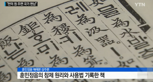 지난 7일, '훈민정음 해례본 상주본'의 소유주로 알려진 고서적 수집 판매상 배씨는 한 매체와의 인터뷰를 통해 "국가가 나서 1000억원을 보상해주면 훈민정음 해례본 상주본을 당장 내놓겠다"고 말해 이목이 집중되고있다.